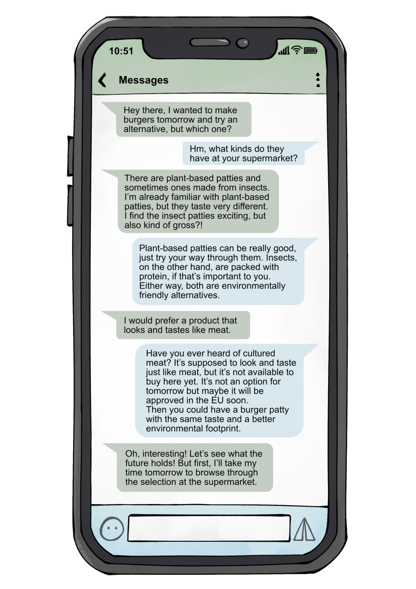 A meat alternative should taste similar to meat, be environmentally and animal-friendly, and be affordable. On the other hand, it is important to address uncertainties, fears, and disgust surrounding such alternatives. Plant-based, insect-based, and cultivated meat alternatives differ in these characteristics but are more sustainable than conventional meat in many respects. It is likely that this diversity of alternatives is necessary to ensure that there is an option available for all consumers.