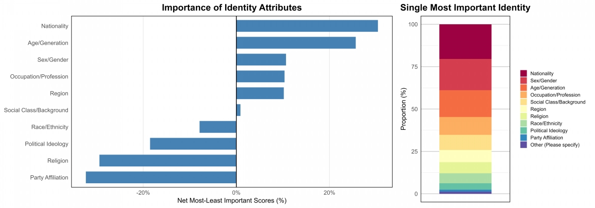 affiliation and political ideology consistently ranked among the least important dimensions across both metrics, with fewer than 5% of respondents selecting them as their defining